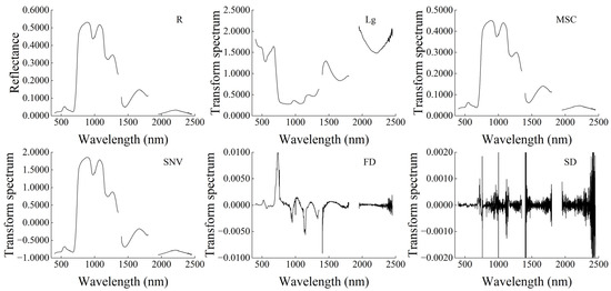 Original spectrum and preprocessing spectra. Note: R, Lg, MSC, SNV, FD, and SD are original spectrum, reciprocal logarithm transformation spectrum, multiple scattering correction transformation spectrum, standardized normal variate transformation spectrum, first derivative transformation spectrum, and second derivative transformation spectrum, respectively. The same below.