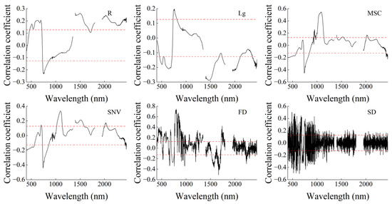 Figure 4 shows the correlation between R and preprocessing spectra and AGDB of all samples. The correlation coefficient between R and AGDB ranged from −0.2332 to 0.2640, and the preprocessing algorithms can improve the correlation between spectral reflectance and AGDB to varying degrees. There were differences in the band positions when each spectrum had a significant correlation with AGDB. In general, FD preprocessing had the best effect on improving the correlation between original spectral reflectance and AGDB, followed by MSC, SD, SNV, and Lg. In addition, there were some differences in the band positions when the correlation reached the highest, which were 1400 nm, 1479 nm, 1083 nm, 741 nm, 797 nm, and 486 nm, respectively. It can be seen that each preprocessing algorithm has different effects in reducing noise interference and amplifying useful information in the spectral curve.