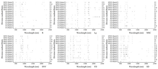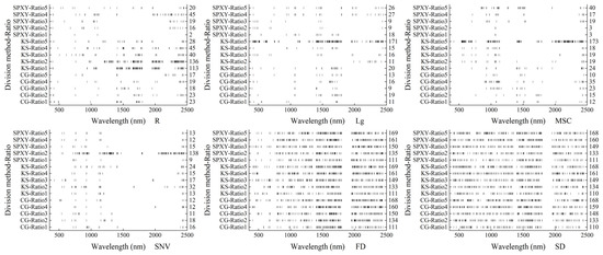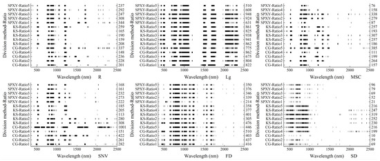 In this study, the UVE algorithm was selected to screen hyperspectral bands, and the screening results are shown in Figure 5. It can be seen from the figure that the effect of using UVE to screen bands was different based on different preprocessing spectra. Among them, the bands that were screened based on R were distributed mainly in the range of 500–540 nm, 750–1000 nm, and 1200–1250 nm, but the bands that were screened based on the data sets that were divided via CG and SPXY methods were still distributed in the range of 1300–2450 nm, while the bands that were screened via the KS method were less in the range of 1300–2450 nm. The bands that were screened based on the Lg transformation spectrum were similar to the R results, which were distributed mainly in the range of 400–500 nm, 700–1110 nm, 1470–1530 nm, 1650–1800 nm, and 2000–2330 nm. The bands screened based on the MSC transformation spectrum were distributed mainly in the range of 500–530 nm, 750–1000 nm, 1100–1220 nm, and 1310–1350 nm. Among them, the bands that were screened based on the data sets that were divided by the KS and SPXY methods were still distributed to a small extent in the range of 1450–2450 nm. The bands that were screened based on the SNV transformation spectrum were distributed mainly in the range of 500–540 nm and 750–1250 nm, and the data sets that were divided by some sample division methods and ratios were also distributed in the range of 1400–2450 nm. The screening results of the bands that were screened based on the FD transformation spectrum were similar under each sample division method and ratio and were distributed mainly in the range of 400–1750 nm. The bands that were screened based on the SD transformation spectrum were distributed mainly in the range of 400–1000 nm. The bands that were screened based on the data sets that were divided by the SPXY method did not include the bands in the range of 1660–2449 nm. As far as the number of screening bands is concerned, the distribution ranged from 10 to 1001. The number of screening bands that were based on the R, Lg, MSC, SNV, FD, and SD spectra was 148–344, 510–948, 76–385, 113–1001, 214–510, and 10–319, respectively. The number difference based on R is small, while the number difference based on the SNV transformation spectrum is large. It can be seen that there were certain differences in the effect of using UVE to screen bands based on different preprocessing spectra, sample division methods, and division ratios.