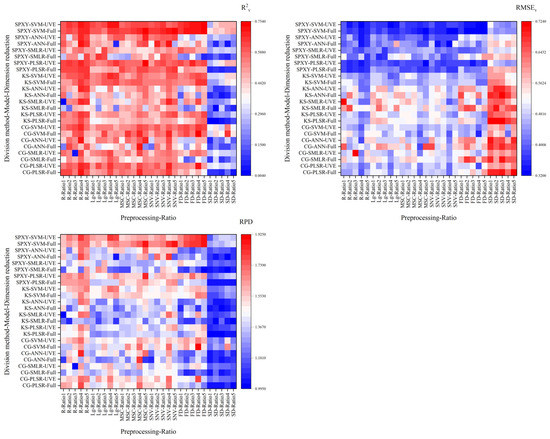 In this study, according to the correlation coefficient between each modeling effecting factor and RMSEv, the effect degree of each factor on the model accuracy is analyzed. It can be seen from Table 2 that the correlation coefficient between each factor and the model accuracy reached a very significant level, indicating that these correlations had certain reliability. The order of correlation between each factor and model accuracy was the sample division method, preprocessing algorithm, sample division ratio, whether to reduce dimension, and modeling method. Among them, there was a positive correlation between the preprocessing algorithm and the model accuracy, which may be related to the low accuracy of the model based on SD spectrum. The model accuracy was negatively correlated with the sample division ratio, sample division method, modeling method, and whether to reduce dimension. This was consistent with the results that the validation accuracy was mostly the highest under Ratio4 or Ratio5, the model accuracy constructed via the SPXY method was higher than that constructed via the CG method and KS method, the SVM had higher modeling accuracy, and the model validation accuracy that was based on the UVE band was higher.