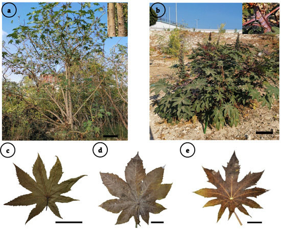 (a,b) Photographs of Ricinus communis: (a) very tall grayish-green stem showing both condensed and elongated internodes (sample no 7), (b) short purple-waxy stem (sample no 4). (c–e) Dried herbarium leaves of the plant: (c) mesophyll blade with lanceolate lobes (sample no 11) and (d,e) macrophyll blade. (d) First, second and third lobes are oblong and the fifth is lanceolate (sample no 24). (e) First, second and third lobes are lanceolate and the fifth is linear-lanceolate (sample no 17). Scale bar = 30 cm (a,b); 4 cm (c–e).