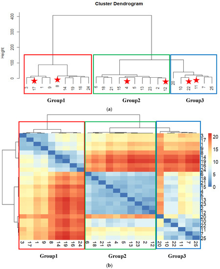 Different software was used to analyze the data, including Excel 365, Minitab version 20, and R software (Vienna, Austria); the latter had the necessary packages loaded [66]. The mean and standard deviation were computed as descriptive statistics for each component. Based on several measurable qualities, interpretive multivariate statistics were employed to divide the 25 samples into many homogenous groups.