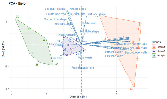 The principal component analysis (PCA) performed for the twenty-five samples (Figure 4), based on 27 quantitative characters, revealed that the first axis (Dimension 1) scored 56.5%, followed by the second axis (Dimension 2) that accounted for 12.8% of the total variation. The first axis separated group 1 and sample 6 (belonging to group 2) from groups 2 and 3. The second axis split samples of group 1 (except 16 and 24), samples 4, 5, and 18 of group 2, and samples 10, 11, and 20 from group 3. The significant characteristics attributed to the ordination of dimensions 1 and 2 and their correlation values are summarized in Table 3. For dimension 1, the highest contribution was for the leaf area (0.987), and the lowest was for the leaf length/width ratio (0.425). In contrast, dimension 2 recorded a higher correlation for the third lobe length/width ratio (0.818), and the lowest was the fifth lobe length/width ratio (0.463).