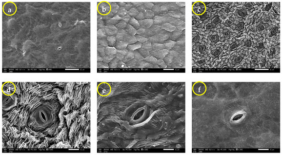 For the AD surface, showing a significant difference between all samples, the stomatal size with the closed pore was 5.82–13.17 × 2.66–6.30 µm, and its area varied from 10.24 to 56.13 µm2 (Figure 6a), while the stomatal size with an opened pore was 6.76–132.49 × 3.38–65.73 µm with a pore size is 4.13–116.03 × 1.13–33.07 µm. The stomatal and pore areas were in the range of 16.95–6780.36 µm2 and 3.30–2403.10 µm2, respectively (Figure 6c). The epidermal cell length was 26.36 ± 9.19 µm, the width was 16.04 ± 6.00 µm, and the area was 451.23 ± 287.98 µm2 (Figure 6e).
