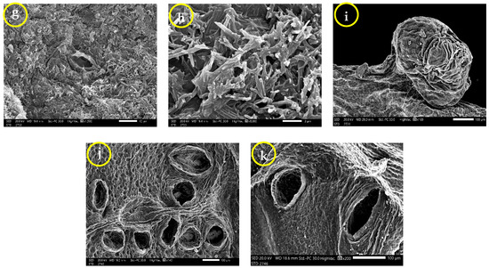Anomalous stomata were noticed in their opened state on both leaf surfaces of samples 8 and 12 (Figure 5j,k, respectively). At the AB surface, the stomatal size was 166.47–286.33 × 94.33–175.33 µm, and their area was 15,004.28–39,840.30 µm2. The stomatal pore size was 143.68–250.68 × 70.55–133.05 µm, and its area ranged from 8122.01 to 21,468.05 µm2, while at the AD surface, the measured stomatal size was 139.60–333.94 × 88.83–150.85 µm and its area was 10,707.04–35,927.39 µm2. Its pore size was 120.99–235.04 × 54.20–122.28 µm, and the pore area was 6063.53 to 20,388.87 µm2.