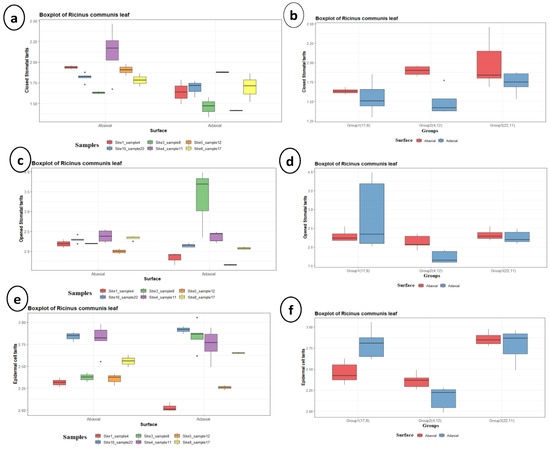 Boxplots of the leaf ultrastructure traits of Ricinus communis for all samples and for groups, respectively. (a,b) closed stomatal traits, (c,d) opened stomata, (e,f) epidermal cell size traits.