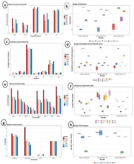 Bar plots and boxplots for soil analysis per site and for groups, respectively: (a,b) soil texture and profile, (c,d) nutrient concentrations, (e,f) soluble salts concentration, and (g,h) CaCO3 (%), EC (ds/m), organic matter (O.M %), and pH.