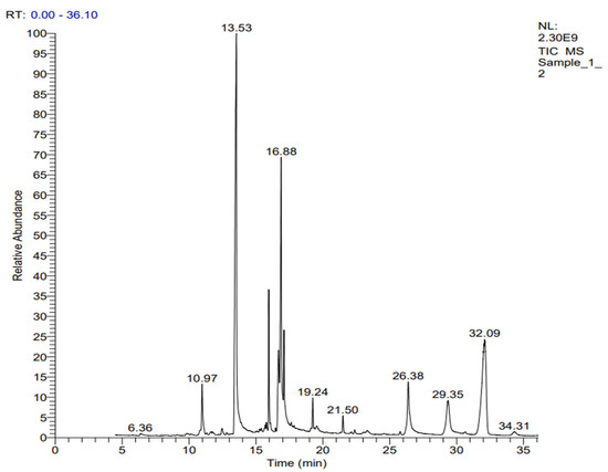 The hexane extracts of R. communis samples using GC-MS are presented in Table 7. The total ion chromatograms are shown in Figure 8. The peaks were distributed at a retention time of 6.36–34.31. Comparing the analytical data revealed differences in the quantitative composition of phytochemicals between different samples.
