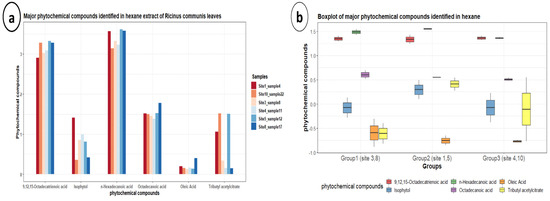 (a,b) Bar plots and boxplots for major phytochemical compounds identified in hexane extract of Ricinus communis per site and for groups.