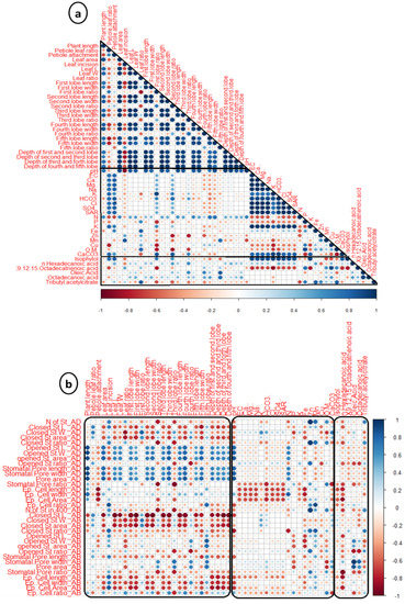 Pearson’s correlation analysis was performed to explore the relationship and correlation between examined parameters (the macro- and micromorphological characters, soil analysis, and chemical composition) (Figure 10a,b). The results showed a significant positive correlation (p ≤ 0.05) between vegetative morphological traits, which confirms the discrimination of the resulting groups (morphotypes).