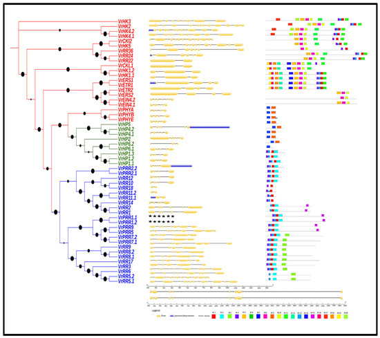 The genomic Table 2 examines the detailed physio-chemical properties of the 54 VrTCS proteins. VrTCSs are found on chromosomes 1–10. The length of the proteins ranged from 111 amino acids (VrHP5) to 1265 amino acids (VrHk1.1), and the number of exons ranged from 2 to 14. ExPASY analysis shows that the VrTCS proteins’ isoelectric points range from 4.53 to 8.69, their molecular weights range from 12,940.53 Da to 141,438.69 Da, and their stability index ranges from 24.28 to 71.26. In addition, the aliphatic index and GRAVY of VrTCS were computed, with values ranging from 66.68 to 107.17 and 0.828 to 0.122, respectively.