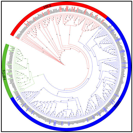 Evolutionary analysis of VrTCS with other plant species. The red color clades represented histidine kinase, blue represents the response regulators and the histidine phosphotransfer is represented by green colors.