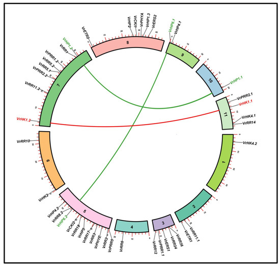 Representation of potential VrTCS genes on chromosomes. The circular bar scale indicates the length of the chromosomes in MBs and the numbers in the circular bar represent chromosomes number. The duplicated gene pair is represented by colored lines.