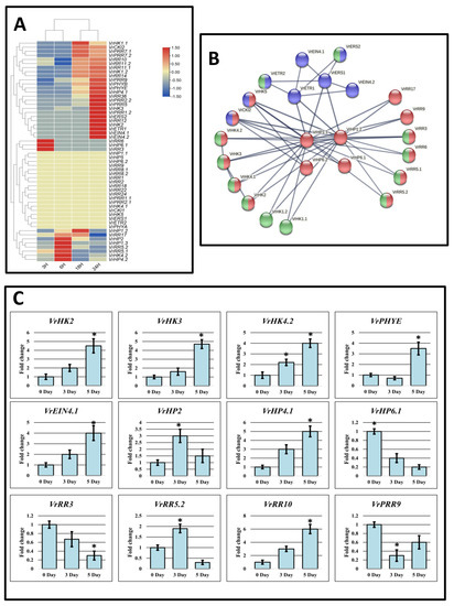 (A) Heat map representation of VrTCS genes under drought stress. The blue color represents gene down-regulation, the red color represents gene up-regulation, and the skin color represents gene null regulation. (B) VrTCS protein–protein interaction. The genes involved in cytokinin-activated signaling pathways were colored red, while the genes involved in ethylene-activated signaling pathways were colored blue. The proteins that respond to abiotic stimuli were highlighted in green. (C) TCS gene expression profiling in response to drought stress. The data represent the means (standard deviations) of three biological replicates. The vertical bars represent standard deviations and (*) represents the significantly up regulation of the genes.