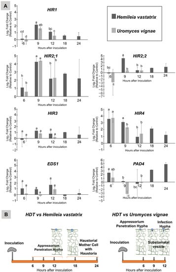 Expression profile of HIR, EDS1 and PAD4 genes in leaves of HDT inoculated with Hemileia vastatrix or Uromyces vignae. Fold change was calculated relative to control leaves sprayed with water during leaf infection (A). Inoculation was conducted with rust urediniospores. Leaf infection was monitored and sampled 6, 9, 12, 18 and 24 h after inoculation as detailed in the drawings depicted in (B), also included is the predominant fungal structure detected in each time-point. Different lower cases indicate significant differences among treatments.