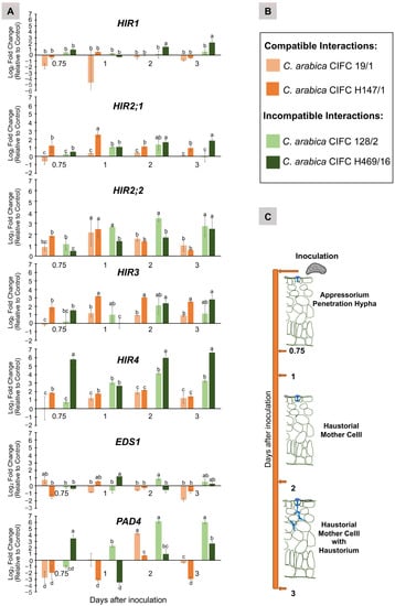 The transcript profile of the HIR gene family and PAD4 and EDS1 genes were followed along the infection process under the same experiment layout used to construct the HDT832/2 transcriptome. Three and six time points were chosen: 6 hai, 9 hai and 12 hai for the nonhost interaction with U. vignae (U) and 6 hai, 9 hai, 12 hai, 18 hai and 24 hai for the host interaction with H. vastatrix (H). Ct values from samples H, U, and control (C) were subject to a prior normalization using Actin-11, Polyubiquitin-like, and Tubulin alpha-2 chain reference genes. The fold change was calculated between the inoculated leaves (U and H) and non-inoculated leaves (C) using the equation depicted in Section 2.5 (Figure 1).