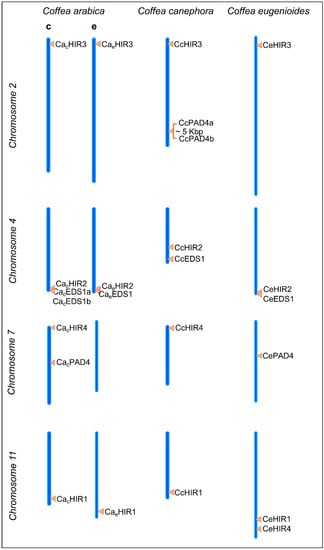The availability of three annotated genomes of Coffea species, Arabica, and its parents permitted us to characterize in detail the HIR gene family, EDS1 and PAD4 genes, and furthermore compared it with the sequences in HDT transcriptome. Coffea genomes, as expected, revealed similar gene localization on the chromosomes between species, with the exception of HIR4 and PAD4 genes. Interestingly, in the C. arabica genome, both genes were lost in the chromosomes from the C. eugenioides parent. Since CeHIR4 is located at the 3′ end of chromosome 11 in C. eugenioides and chromosome 11 from C. arabica is shorter, which could result in an erroneous resolution of chromosome 11 end and/or a flawed chromosome 11e assembly.