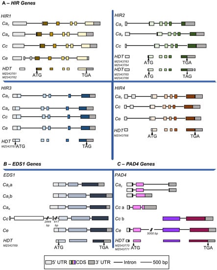 HIR, EDS1, and PAD4 proteins are directly involved in the fulfillment of plant immunity. EDS1 and PAD4 genes are of special interest since they are good targets for improving the resistance potential [], but they can also influence drought tolerance and increase biomass production, as observed in Populus [,]. EDS1 and PAD4 genes, and their protein complex, have been functionally characterized in Arabidopsis and Nicotiana. The unexcepted gene structure uncovered in the PAD4 gene from C. arabica or EDS1 from C. canephora needs to be further explored to characterize the real impact that the different structures of the genes may have in the capacity for basal resistance and TIR-NLR drive immunity.