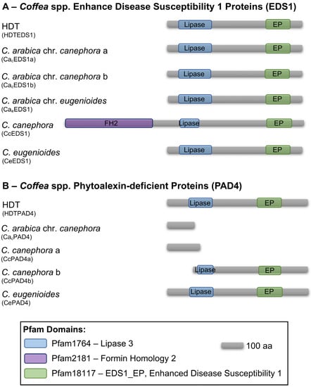 Schematic representation of the conserved domains of EDS1 (A) and PAD4 (B) proteins in Coffea spp. predicted proteins. The conserved motifs identified by screening the Pfam database (http://pfam.xfam.org) (accessed on 2 November 2022) were: Pfam02181, Formin Homology 2; Pfam01764, Lipase 3; Pfam018117, EDS1_EP, Enhanced Disease Susceptibility 1 EP Domain. Protein are represented in gray boxes, and conserved domains in colorful boxes.