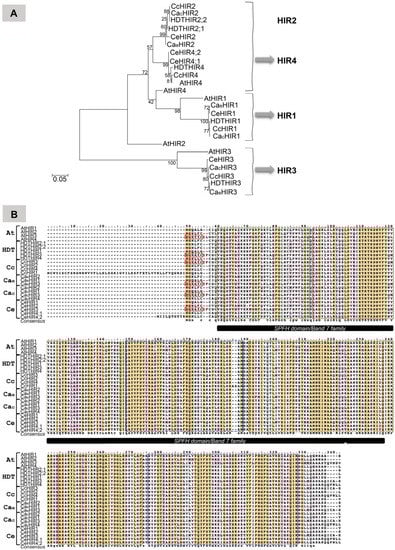 A. thaliana HIR protein family has been studied in detail, and some of their members have been functionally characterized (e.g., []). We conducted a phylogenetic analysis between HIR proteins from Arabidopsis thaliana and Coffea spp. in an effort to create an association between them and gain insight into the function of HIR proteins from Coffea spp.