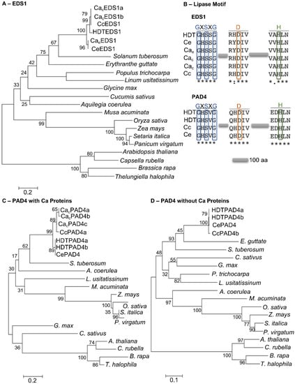 EDS1 and PAD4 proteins have been characterized as important components of plant immunity to pathogens (e.g., []). The phylogenetic relationship between EDS1 and PAD4 Coffea spp. proteins and a select group of plant species were inferred using the maximum-likelihood method []. EDS1 and PAD4 orthologs were identified in sequenced plant genomes from different plant families, namely the Poaceae, Brassicaceae, and Solanaceae [].