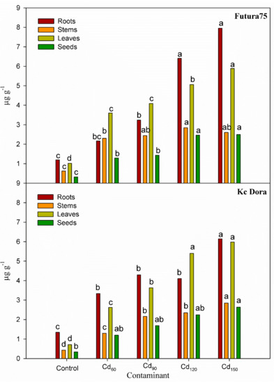 Concentration of cadmium (µg g−1) in roots, stems, leaves, and seeds in Futura 75 and KC Dora. The comparisons were performed within the fractions of the plants. Different letters indicate significant differences between the means (according to HSD at p ≤ 0.05).