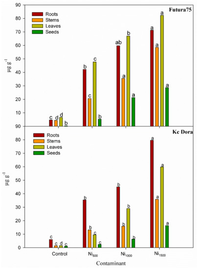 Concentration of nickel (µg g−1) in roots, stems, leaves, and seeds in Futura 75 and KC Dora. The comparisons were performed within the plant fractions. Different letters indicate significant differences between the means (according to HSD at p ≤ 0.05).