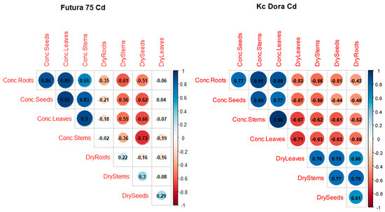 Correlation matrix of Cd of Futura75 and KC Dora, using as the variable the biomass yield of roots, stems, leaves, and seeds, and the concentration of the heavy metal measured in each part of the plant. The numbers within the circles represent the Pearson correlation coefficient.