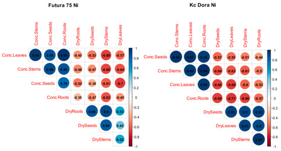 Correlation matrix of Ni of Futura 75 and KC Dora, using as the variable the biomass yield of roots, stems, leaves, and seeds, and the concentration of the heavy metal measured in each part of the plant. The numbers within the circles represent the Pearson correlation coefficient.