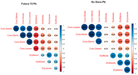 Correlation matrix of Pb of Futura 75 and KC Dora, using as the variable the biomass yield of roots, stems, leaves, and seeds, and the concentration of the heavy metal measured in each part of the plant. The numbers within the circles represent the Pearson correlation coefficient.