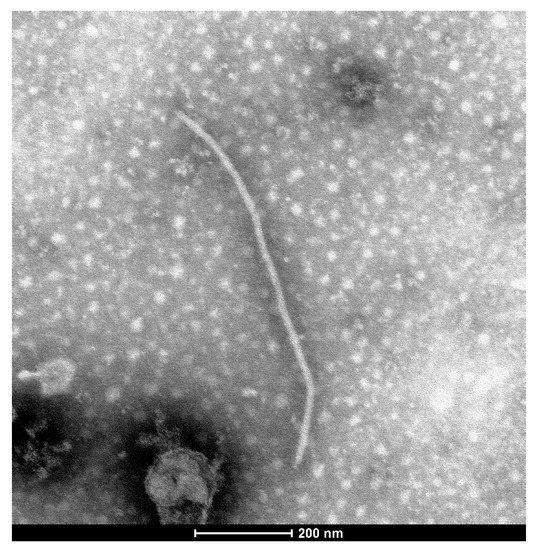 In September 2021, white clover plants with typical viral disease symptoms of leaf mosaic and redding were observed on the campus of Inner Mongolia Agricultural University in Hohhot, Inner Mongolia, China (Figure 1a). In the crude sap of the original symptomatic white clover leaves, flexuous filamentous viral particles of about 700 nm in length and 13 nm in width were observed using transmission electron microscopy (Figure 2). The characteristics of these particles were consistent with the morphology and dimensions of potyviruses [23]. No particles were observed in white clover plants of healthy controls.