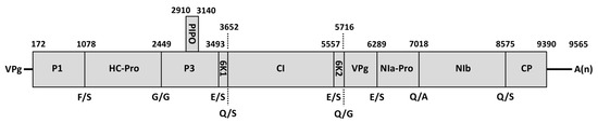 Genomic structure of clover yellow vein virus ClYVV-IM isolate. The nucleotide positions of the cleavage sites are indicated above, and the amino acid sequences of the cleavage sites are shown below. P1, the first protein; HC-Pro, helper component-proteinase; P3, the third protein; 6K1, 6 kDa protein 1; CI, cytoplasmic inclusion protein; 6K2, 6 kDa protein 2; VPg, viral genome-linked protein; NIa-Pro, nuclear inclusion a protease; NIb, nuclear inclusion b protease; CP, coat protein; PIPO, pretty interesting potyvirus ORF.