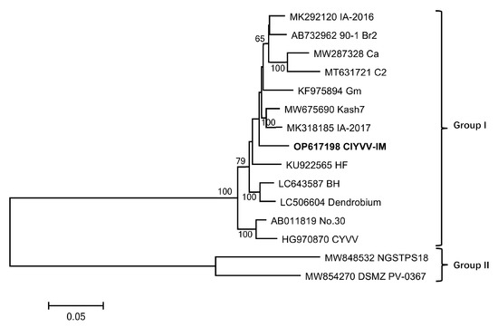Phylogenetic analysis of clover yellow vein virus based on polyprotein nucleotide sequences by maximum likelihood method with 1000 bootstrap replicates using MEGA 11. The accession numbers and isolate names are indicated, and ClYVV-IM determined in this study is marked in bold.