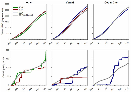 Daily weather data at the three sites were obtained from the Utah Climate Center (Logan, UT, USA) and were used to calculate cumulative precipitation and growing degree days for each season. The corn growing degree days (GDDs) were calculated using a base air temperature of 10 °C and an upper threshold of 30 °C. These values are the standard base temperature and upper limits for corn despite end use and were thus used for the calculations. Measured cumulative precipitation and degree days were compared with their respective 30-year normal (1991–2020) provided by the National Oceanic and Atmospheric Administration (Silver Springs, MD, USA).