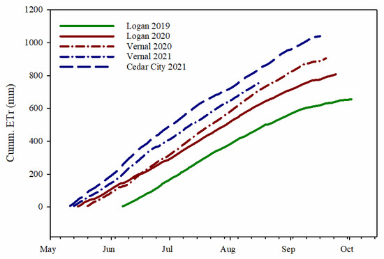 Different soil types and weather often lead to different irrigation needs, which is evident from irrigation totals (Table 2), reference ET (Figure 3), and yields for the 100% irrigation rate for each site. For 2019, the above-average precipitation year, 330 mm of irrigation was used for the full irrigation rate and yielded 19.5 Mg ha−1 across all treatments excluding rate. The drier year of 2020 at both Logan and Vernal displayed similar yields to one another, but required different irrigation amounts to reach those levels. Logan was irrigated with 350 mm and produced 26.6 Mg ha−1 of silage corn, and Vernal with 70 cm of irrigation to produce 26.3 Mg ha−1. These yields, irrigation amounts, and reference ET (Figure 2; Table 2) demonstrate that the soils in Vernal demand a higher quantity of irrigation compared to Logan. The difference in yield between 2019 and 2020 for Logan with roughly the same irrigation amounts is also noteworthy, though yield was limited for 2019 by the shorter growing season, with the corn planted June 7th due to wet conditions in May. The Cedar City and Vernal sites were planted one day apart in 2021. Cedar City had a full irrigation supply, yielding 19.1 Mg ha−1 with 53 cm of irrigation. Vernal did not have a full irrigation supply due to drought, and the highest irrigation level yielded 15.1 Mg ha−1 with 290 mm of irrigation.