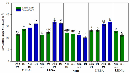 Silage corn yield for interactions of non-drought-tolerant corn genetics (non-DT) and drought-tolerant corn genetics (DT) in five irrigation systems (MESA (mid-elevation spray application), LESA (low-elevation spray application), MDI (mobile drip irrigation), LEPA (low-elevation precision application), and LENA (low-elevation nelson advantage)). Error bars represent standard errors. Letters above bars represent mean separations conducted by site-year with protected Fisher’s LSD at α = 0.05. Letter format designates mean separation for each site-year, with uppercase as one and lower case as the other.