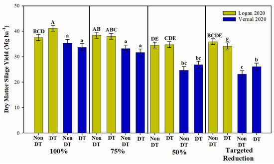 Two of the five site-years had significant irrigation rate × corn genetics interactions for dry matter yield (Table 3). Both occurred in 2020 at the Logan and Vernal sites. In Logan, DT genetics increased yield by 10% over the non-DT genetics (41.2 compared to 37.5 Mg ha−1) at the 100% irrigation rate (Figure 4). However, DT genetics did not improve silage corn yield in the three reduced irrigation treatments in which the benefits of DT genetics should be more pronounced. This suggested few to no benefits of the DT genetics in water-stress or drought conditions. However, regardless of corn genetics, the reduced irrigation rates rarely reduced silage corn yield. Despite our best effort to stress corn that year (about 180 mm of irrigation in the 50% irrigation rates compared to 350 in the full irrigation), the low irrigation rates still provided sufficient water to match full irrigation quantity. Thus, drought conditions were not prevalent in that site-year and likely contributed to the lack of response to DT genetics.