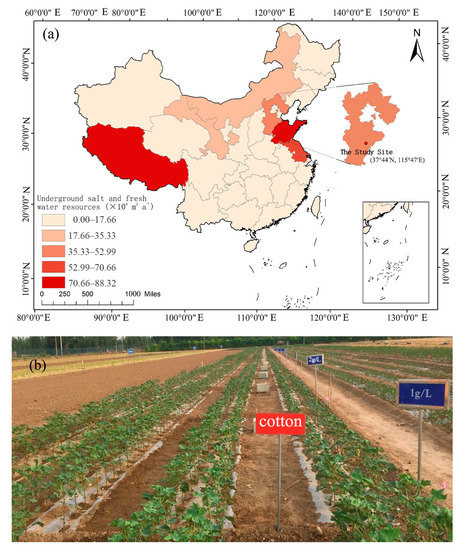 (a) Location of the study site and (b) plots of long-term saline irrigation experiment. Note: The data come from the results of a groundwater resource evaluation in 2003. Accessed on 15 March 2021. (http://www.cigem.gov.cn/kjqb/jx001_1.htm).