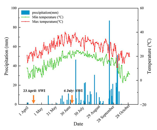 The irrigation dates and quotas of the six treatments were the same during the experiment. Irrigation water of 75 mm was applied on 23 April and 6 July. Daily air temperatures and precipitation were collected from a weather station (Figure 2). The rainfall was 587.6 mm during the experimental period. The rainfall in the bud stage (from 14 June to 11 July) and the flowering and boll stage (from 12 July to 28 August) were 71.20 mm and 159.60 mm, respectively.