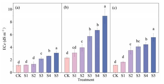 ECe had a consistent trend in the three stages (BE, BS, and FBS). It showed an increasing trend with increased irrigation water salinity (Figure 3). Compared with CK, S3–S5 of BE significantly increased by 88.80–167.79% (p < 0.01) (Figure 3a), while S2–S5 significantly increased by 70.15–284.66% and 41.60–375.86% in BS and FBS (p < 0.01), respectively (Figure 3b,c). ECe in BS and FBS was 101.01–188.74% and 1.32–80.05% higher, respectively, than that in BE. Soil salinity decreased in FBS, which may be related to the rainfall in FBS (159.60 mm) being higher than that in BS (71.20 mm).