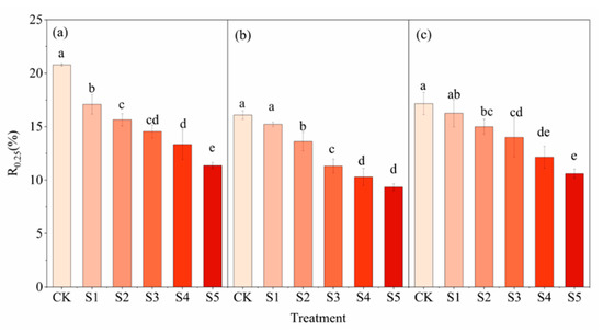 Water-stable aggregate content (R0.25) in different growth periods of cotton under SWI. (a) R0.25 in BE; (b) R0.25 in BS; (c) R0.25 in FBS. Letters a, b, c, d and e located above columns indicate that the means of each column are/aren’t significantly different (p ≤ 0.05) according to Duncan’s multiple range test (DMRT). Columns that share the same letter are not significantly different according to the DMRT (p ≤ 0.05). Columns labeled with the different letters are significantly different according to the DMRT (p ≤ 0.05).
