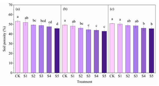 The variation of soil porosity in the three stages was generally consistent and showed a decreasing trend with increased irrigation water salinity (Figure 5). Compared with CK, the soil porosity of S2–S5 reduced significantly by 7.39–14.10% (p < 0.05) and 6.52–13.01% (p < 0.01) in BE and BS, respectively (Figure 5a,b). By contrast, the porosity with S4–S5 treatments significantly decreased by 9.43–10.37% compared with CK in FBS (p < 0.05) (Figure 5c). Compared with BE (Figure 5a), the soil porosity decreased by 6.20–9.06% and 0.30–4.45% in BS and FBS, respectively (Figure 5b,c).