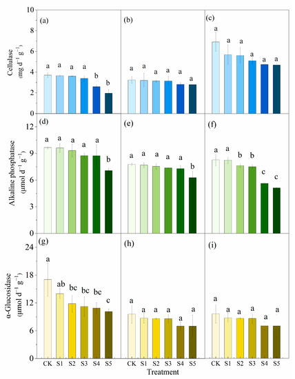 The soil enzyme activity decreased as irrigation water salinity increased. The cellulase activity of S4 and S5 was significantly lower than that of CK in BE (p < 0.05) (Figure 6a–c). Compared with BE, the alkaline phosphatase activity of BS and FBS was decreased by 11.03–20.00% and 14.25–35.58%, respectively (Figure 6d–f), and the α-glucosidase activity of BS and FBS was decreased by 23.52–43.76% and 21.83–37.45%, respectively (Figure 6g–i). Moreover, the activity of the three enzymes in FBS was higher than those in BS.