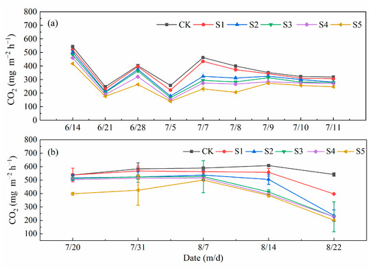 With increased irrigation salinity, soil CO2 emissions decreased (Figure 7). The trends for all treatments were consistent at each date. After the irrigation on 6 July, the CO2 emissions of each treatment increased first and then decreased. Although the soil carbon emissions from SWI treatments (S1–S5) increased after irrigation, they were still lower than those of CK. Compared with FBS, the variations of SR were more intense in BS, and the SR values were lower. The highest emissions in BS and FBS were 543.10 and 607.93 mg m−2 h−1, respectively. The lowest emissions in BS and FBS were 139.59 and 201.35 mg m−2 h−1, respectively (Figure 7).