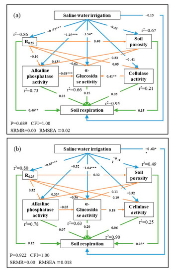 Structural equation model (SEM) of saline water irrigation impacts on soil physical and chemical properties and SR. (a) SEM in BS; (b) SEM in FBS. * p < 0.05, ** p < 0.01, and *** p< 0.005. The numbers adjacent to the lines are the standardized path coefficients, which means how much standard deviation changes the independent variable if each of the independent variables changes by one standard deviation. The blue lines represent the direct effects of SWI on soil physical and chemical properties and SR. Orange lines indicate the interactions of soil physical and chemical properties. Green lines represent the indirect effects of SWI on SR.