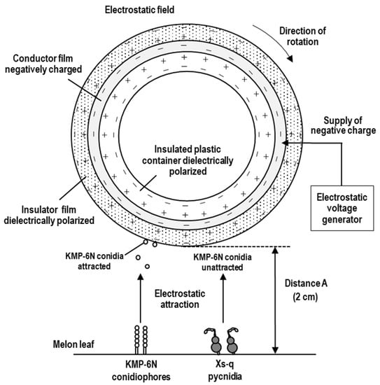An electrostatic spore collector system for collecting progeny conidia released from KMP-6N colonies with and without spray inoculation with hyperparasite spores (cross-sectional view). The electrostatic voltage generator produced a negative charge, which was transferred to the conductor film, inducing a positive image charge on the surface of the insulator film. Dielectric polarisation produced a negative surface charge on the opposite side of the insulator film, and an electrostatic field formed around the dielectrically polarised insulator film. The dielectrically polarised insulated plastic container was timed to revolve once every 24 h. KMP-6N progeny conidia from normal conidiophores were collected on the insulator film by electrostatic attraction. The insulator film (5.2 × 10−1 nC) was placed at <2 cm from a KMP-6N colony on a melon leaf (distance A).