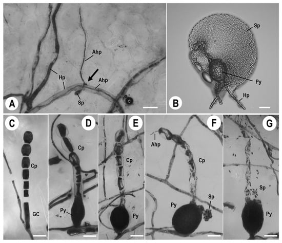 Infection of the Japanese Ampelomyces strain Xs-q in P. xanthii KMP-6N colonies. (A) Light micrograph of Xs-q hyphae that invaded and grew vigorously into KMP-6N hyphae. (B) Digital micrograph of Xs-q spores released from a pycnidium after treatment with a 10 µL drop of distilled water. (C–G) Morphological changes in KMP-6N conidiophores parasitised by Xs-q. (C) Normal KMP-6N conidiophore. (D) Xs-q pycnidium initiated in generative cell (GC) of a KMP-6N conidiophore. (E) Mature intracellular pycnidium produced in a GC of a KMP-6N conidiophore. (F) The hyperparasitic Xs-q strain produced intracellular pycnidia in GCs, and Xs-q hyphae grew out from conidial cells at the apex of the KMP-6N conidiophore. (G) Abundant Xs-q spores released from mature pycnidia. KMP-6N conidiophores atrophied and collapsed without releasing progeny conidia. Light micrographs were taken at 0 (C), 6 (D), 8 (E), 10 (F), and 12 days (G) after spray inoculation with Xs-q spores onto 10-day-old KMP-6N mycelia. Bars represent 10 µm (A) and 20 µm (B–G). Ahp, Xs-q hypha; Cp, KMP-6N conidiophore; Hp, KMP-6N hypha; Sp, Xs-q spore; Py, Xs-q pycnidium.