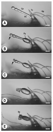 Previous studies have reported that penetration by the hyperparasite A. quisqualis into mycohost structures can occur within 24 h [,], and that its hyphae of hyperparasites continue to grow internally and produce intracellular pycnidia in the mycelia or conidiophores of mycohosts at 5–8 days [,] or 7–10 days [,] after penetration. After infection, the hyperparasites further ramify throughout the mycohost hyphae, resulting in its reduced growth and eventual death []. Németh et al. [] visually clarified the infection processes and conidiogenesis of a Japanese Ampelomyces strain in tomato PM colonies; the foot and GCs of PM conidiophores began to degenerate by ca. 5–6 dpi, and intracellular pycnidia of the hyperparasite strain initiated in basal cells of the conidiophores at ca. 6–8 dpi, followed by the complete collapse of the conidiophores at ca. 10–14 dpi. In the present study, we consecutively observed the degeneration and constriction of hyphae in P. xanthii, followed by intracellular pycnidial formation in the hyphae (ex. Conidiophores). The infection processes and conidiogenesis of the tested hyperparasitic Ampelomyces strain in the melon PM fungus were very similar to those of a tomato PM fungus reported by Németh et al. []. Interestingly, almost all intracellular pycnidia were produced in conidiophores, but not in the hyphae, of the mycohost, as observed by DM, and Ampelomyces hyphae that invaded the PM conidiophores grew out of conidia that formed at the top of the conidiophores.