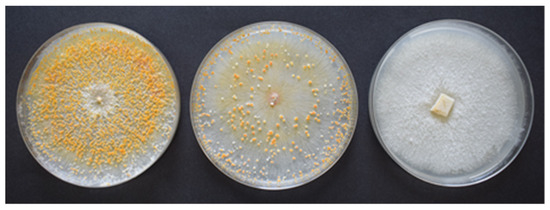 Colonies of Cryphonectria parasitica with different sporulation density: high (left), not analysed for CHV-1 detection; low (centre) and no sporulation (right), analysed for CHV-1 detection.