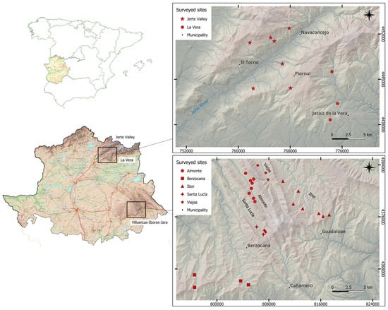 Map of Spain (on the left) where the area of the Autonomous Region of Extremadura and the Province of Cáceres are highlighted. Enlarged representation of the Jerte Valley and La Vera districts (on the upper right) and the Villuercas–Ibores–Jara district (on the lower right) with the identification of the surveyed sites where C. parasitica was detected.